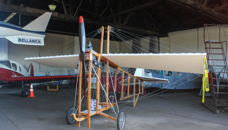 Pictured is a replica of the Parasol Monoplane that Guiseppe Bellanca built when he came to America. One of three planes on our main floor, the other two are a 1948 Bellanca Cruisair, the official State Historical Plane of Delaware, built in New Castle when the factory was operational, and the Bellanca Sky Rocket II, also known as the Avia Bellanca and the first all-composite plane with a thin fiberglass skin.
